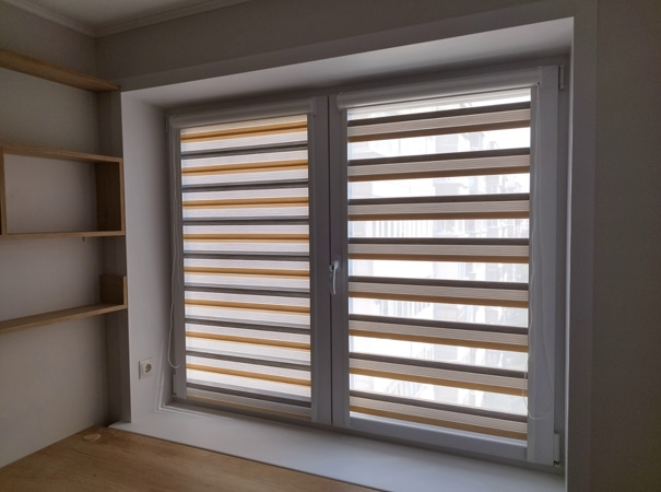 Рольшторы "день-ночь" – это разновидность солнцезащитных систем,, позволяющая регулировать проникновение света в помещение в зависимости от времени суток и потребности. В специально разработанной ткани чередуются полосы затемняющего и прозрачного материала. Прозрачный позволяет мягко рассеивать свет и обеспечивать приватность днем. Более плотные плоски ткани помогают блокировать больше света и обеспечивают дополнительную защиту от посторонних взглядов вечером или ночью.